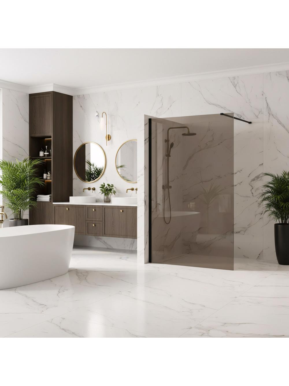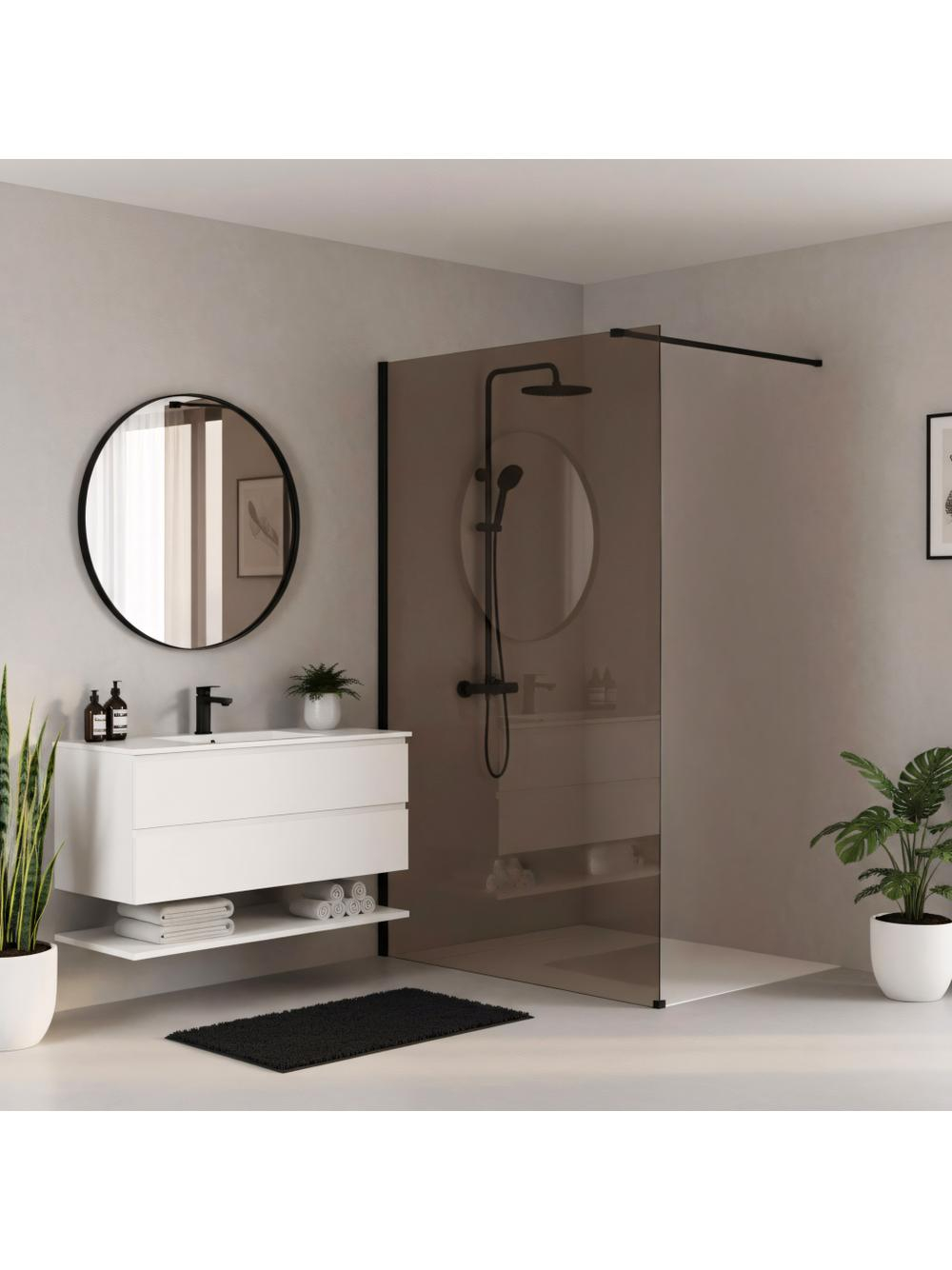 Doriți să creați o atmosferă de loft pentru baia dvs.? Alegeți peretele de duș walk-in Rea Flexi cu panou de sticlă în nuanța Smoked Brown. Această combinație impresionantă între profilul negru mat și sticla fumurie oferă intimitate și eleganță. Realizat din sticlă securizată de 8 mm, acest perete garantează durabilitate și stabilitate.