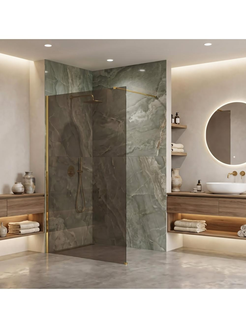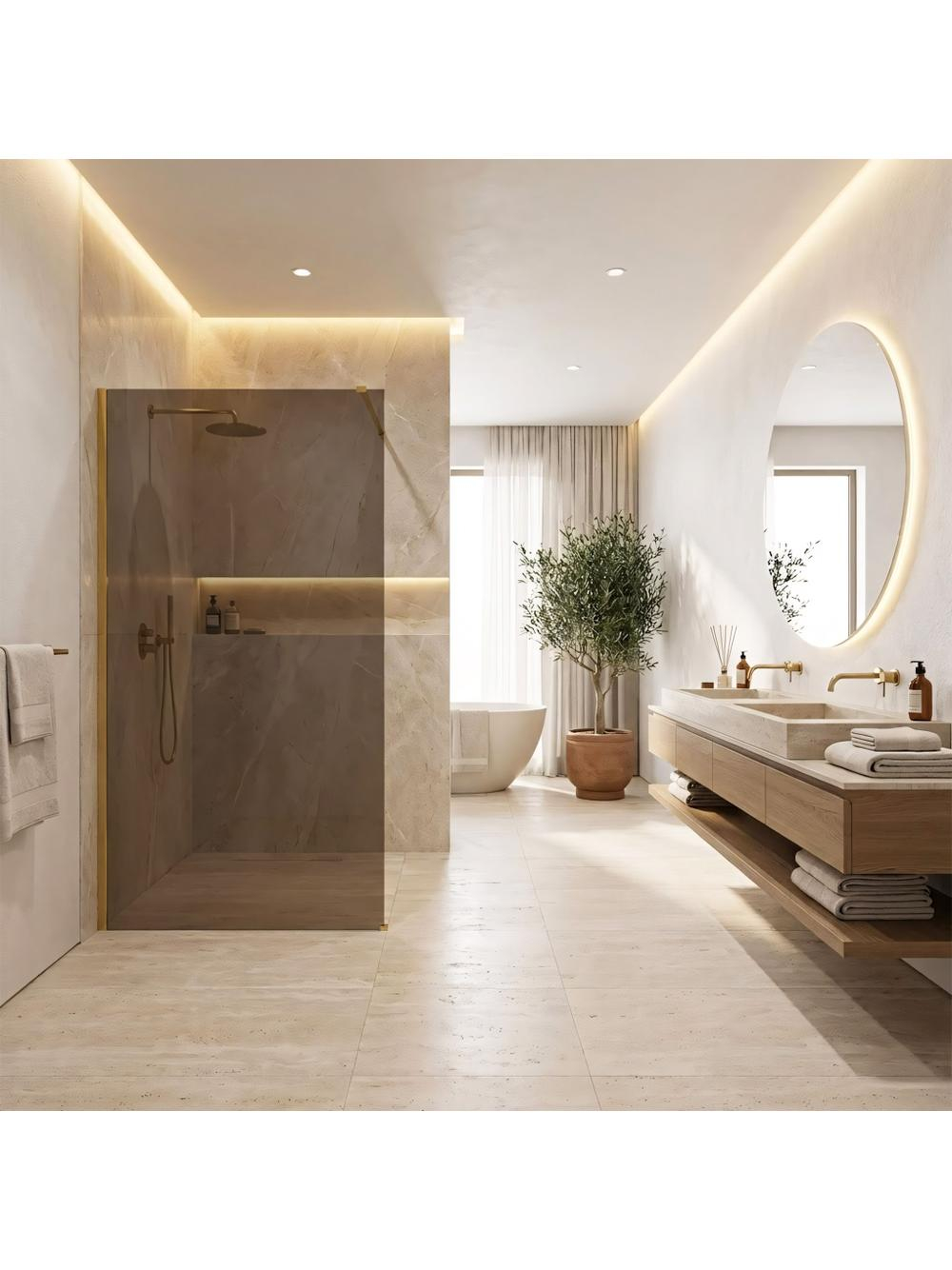 Adaugă un strop de lux în baia ta cu peretele de duș walk-in Rea Flexi într-o configurație elegantă: sticlă în nuanța Maro Fumé și profil în culoarea Auriu Lucios. Această combinație armonioasă aduce un aer sofisticat și primitoare. Sticla securizată de 8 mm garantează stabilitate și siguranță în timpul utilizării. Sticla securizată 8 mm (Maro Fumé) oferă rezistență și discreție, în timp ce profilul din aluminiu Auriu Lucios reflectă frumos lumina. Cu stratul Easy Clean, întreținerea devine simplă. Brațul de susținere ajustabil și montajul universal aduc flexibilitate, iar construcția Walk-In oferă un aspect spațios și liber. Peretele de duș Rea Flexi aduce o atingere clasică, dar modernă, ideal pentru cei care apreciază eleganța.