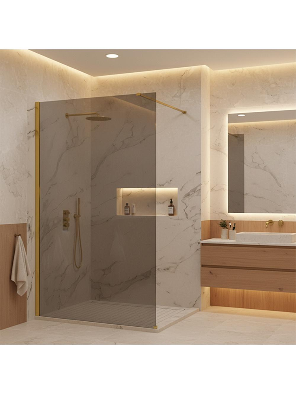 Puneți în valoare caracterul unic al băii dvs. alegând peretele de duș walk-in Rea Flexi cu sticlă Gri și profile în culoarea Auriu Lucios. Această combinație rafinată între panoul grafit și finisajul strălucitor conferă un aer de eleganță modernă interiorului. Realizat din sticlă securizată de 8 mm, acest perete garantează siguranță și rezistență în timp. Alegeți peretele de duș Rea Flexi auriu Gloss Grey pentru un design aparte și rafinat în baia dvs.