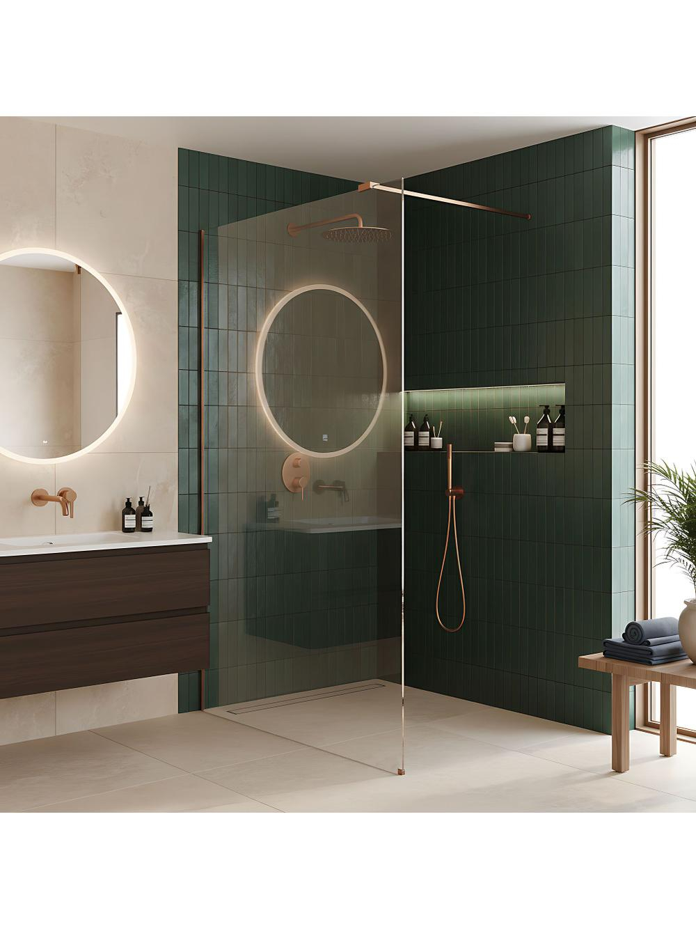 Visați la o baie confortabilă și de lux? Descoperiți peretele de duș walk-in Rea Flexi într-o configurație fascinantă: sticlă transparentă și ramă de cupru periat. Această combinație de design modern și finisaj elegant conferă interiorului un caracter distinct. Fabricat din sticlă securizată de 8 mm, construcția asigură rezistență și stabilitate. Sticla securizată de 8 mm - sticlă groasă și sigură, transparentă, menținând spațiul vizibil. Ramă de aluminiu în cupru periat - finisaj luxos, periat, al profilelor și brațului de susținere, potrivit cu sticla clară. Strat Easy Clean - barieră hidrofobă invizibilă care facilitează scurgerea apei și protejează împotriva depunerilor de săpun și calcar. Bară de stabilizare de 120 cm cu posibilitate de ajustare - brațul superior în culoare cupru poate fi tăiat conform preferințelor individuale. Montaj universal - peretele poate fi instalat pe partea dreaptă sau stângă, pe cadă sau direct pe podea. Construcție Walk-In - acces deschis, modern, fără elemente mobile, pentru comoditate și fiabilitate. Peretele de duș Rea Flexi este alegerea ideală pentru cei care caută un stil sofisticat. Datorită stratului Easy Clean și materialelor solide, produsul îmbină estetica de înaltă clasă cu funcționalitatea zilnică.