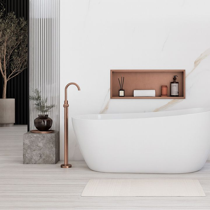 Montajul încastrat conferă un aspect estetic și minimalist, oferind în același timp un spațiu practic pentru depozitarea produselor de îngrijire personală, accesoriilor de baie sau cosmeticelor. Finisajul în cupru periat se potrivește perfect cu alte elemente de design de baie în aceeași nuanță, subliniind caracterul modern al decorului.