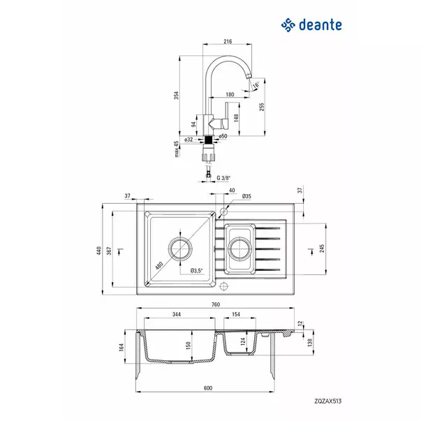 Specificatii tehnice Set chiuveta bucatarie 2 cuve si baterie Deante Zorba negru-grafit 76x44cm: