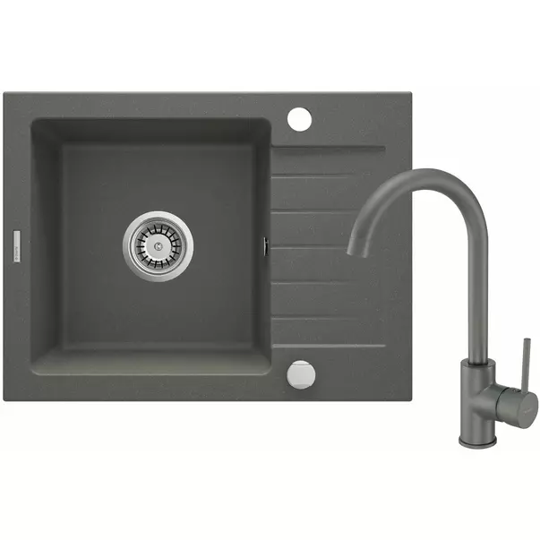 Aranjamentul incluzand chiuveta de bucatarie si bateria Deante Zorba cu finisaj antracit-metalic de dimensiuni 58x44cm reprezinta o alegere eleganta si functionala pentru decorarea bucatariei dumneavoastra.
