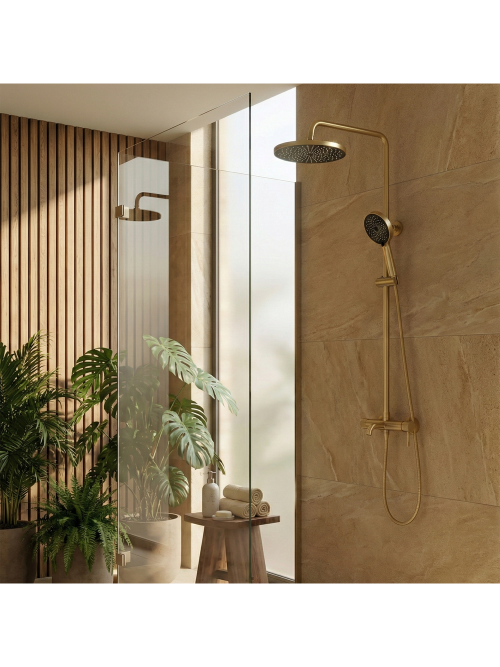 Setul complet include o duș de tip ploaie generos, un duș de mână ergonomic și o baterie aplicată, asigurând o experiență confortabilă în baie. Construit din materiale de înaltă calitate, corpul din alamă garantează funcționarea fără probleme timp îndelungat.